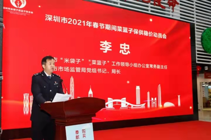 会上,深圳市“米袋子”“菜篮子”工作领导小组办公室常务副主任、市场监管局党组书记、局长李忠作了动员讲话。他表示,市“米袋子”“菜篮子”工作领导小组各成员单位、各市场主体、有关行业协会要迅速行动起来,抓紧做好保供稳价各项工作。通过坚持疫情防控和市场保障两手抓、加强市场供应监测、建立生猪和储备冻猪肉应急机制等措施。确保春节期间深圳菜篮子产品市场供应稳定充足,让市民群众度过一个欢乐祥和、健康安全的春节。